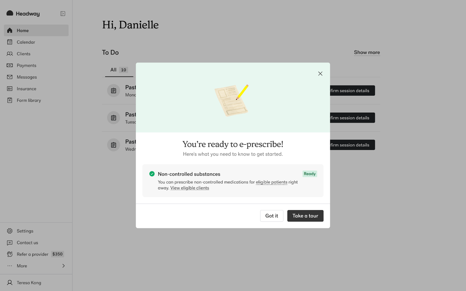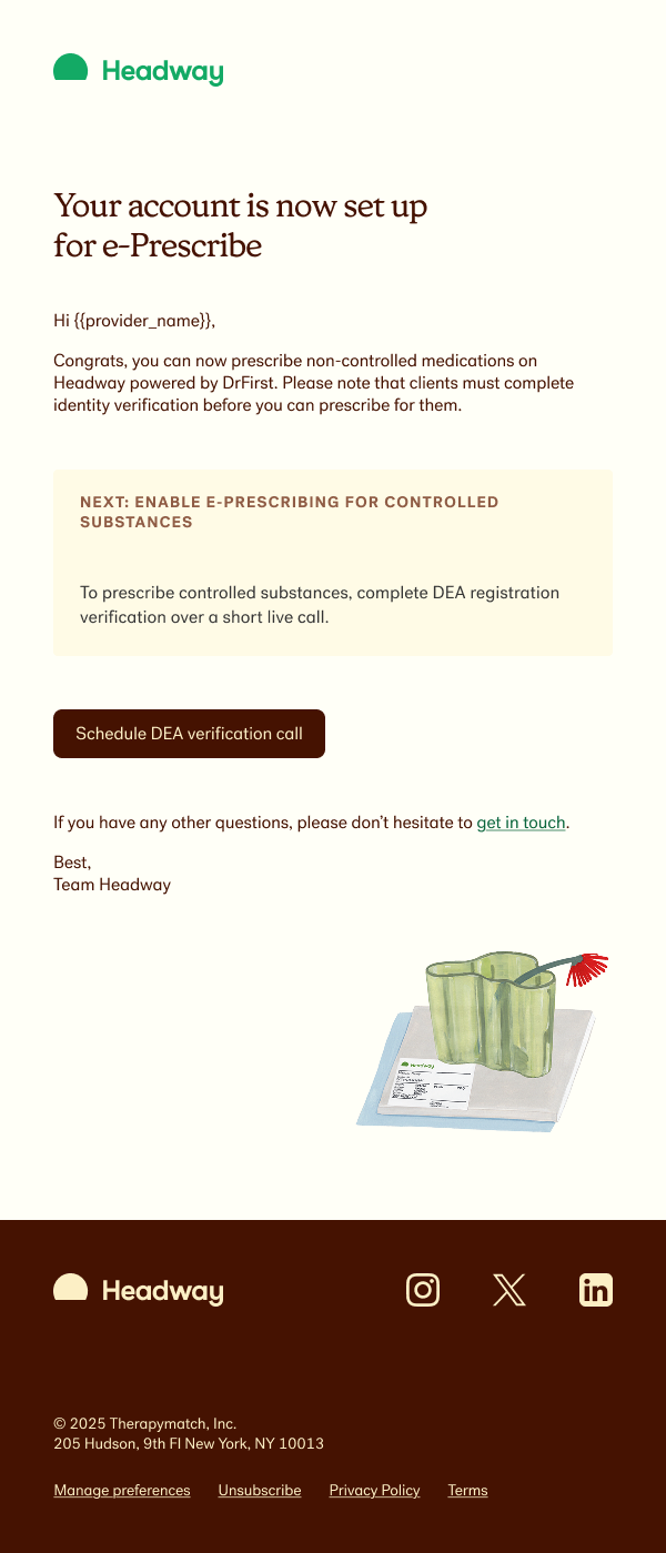 In addition to the 2FA and passphrase you set up in the previous step, you will need to meet with a Headway team member who will verify your DEA number before you can start prescribing controlled substances.