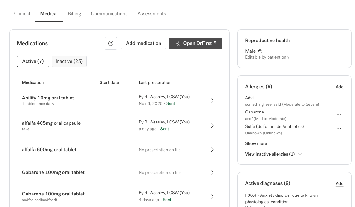 In each client’s profile under the Medical tab, you can review key clinical details like allergies, diagnoses, vitals, and medications before sending a new prescription.This will keep your patient safe and trigger relevant interaction warnings when you prescribe new medications.