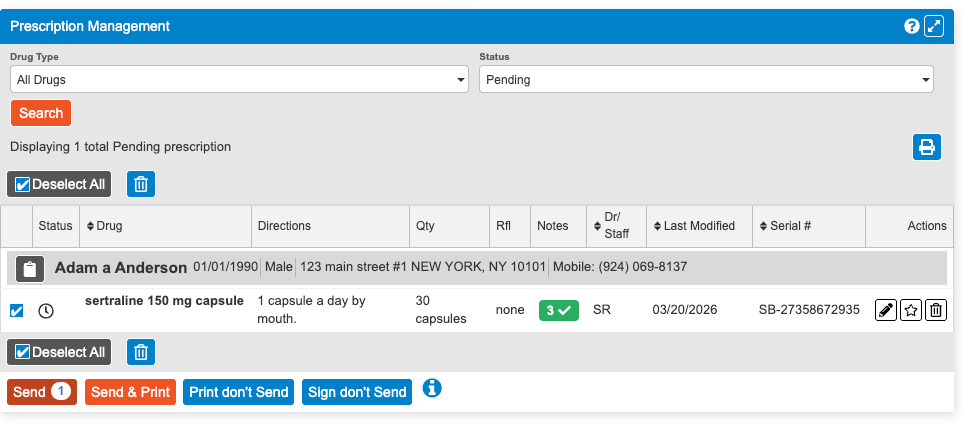 - Then scroll down to the following page and click Send to send the prescription. For non-controlled medications, you can directly send prescriptions.
