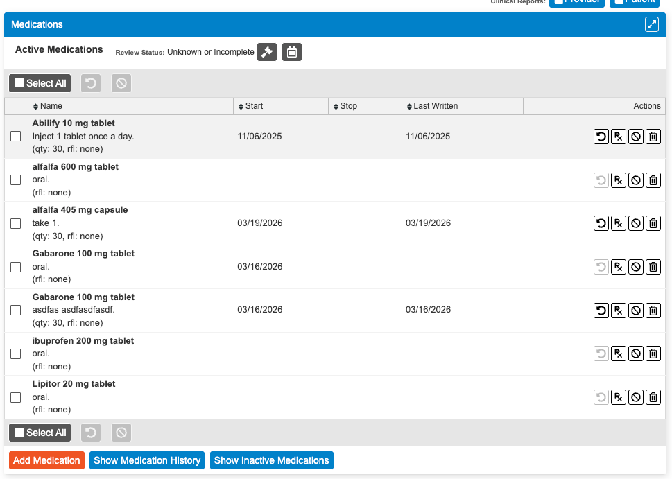 You can also Renew, Prescribe from a Medication, Stop, and Delete from the list of Active Medications.