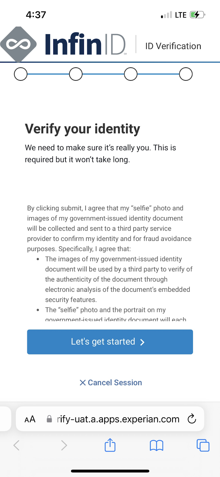 - Scan the QR code on the screen with your phone camera. This will redirect you to an Experian webpage titled “InfinID: ID verification”.