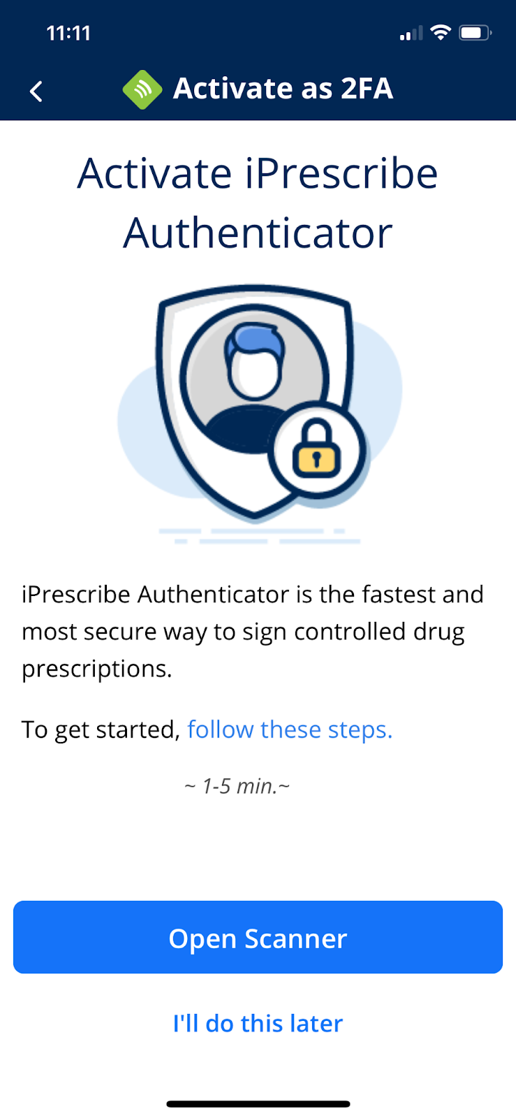 - Scan the QR code to install the iPrescribe Authenticator application to your phone. Please note that DEA requires you to install your authenticator app on a different device than the one you use to e-prescribe controlled substances.