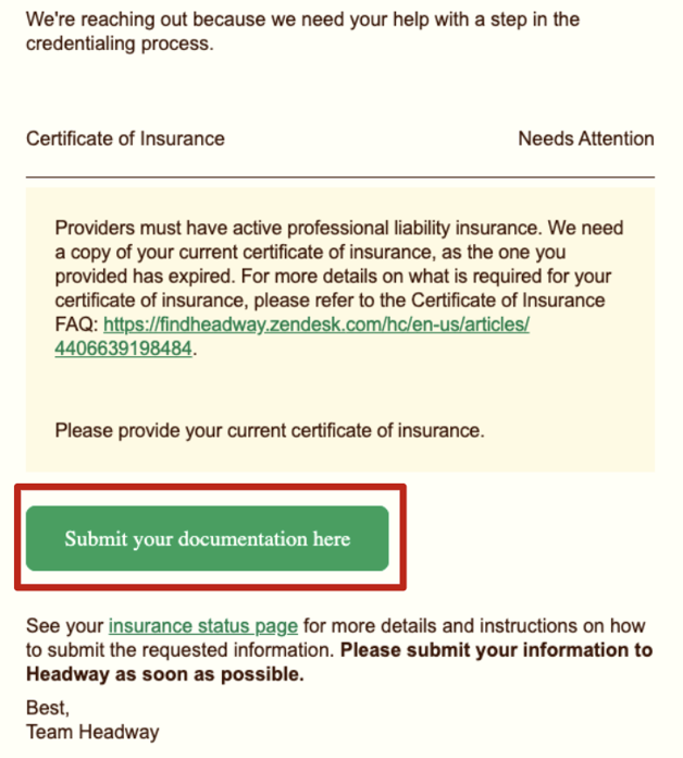 To ensure a smooth credentialing process and maintain your active status on Headway, we may occasionally request additional information or updated documentation after your initial intake.